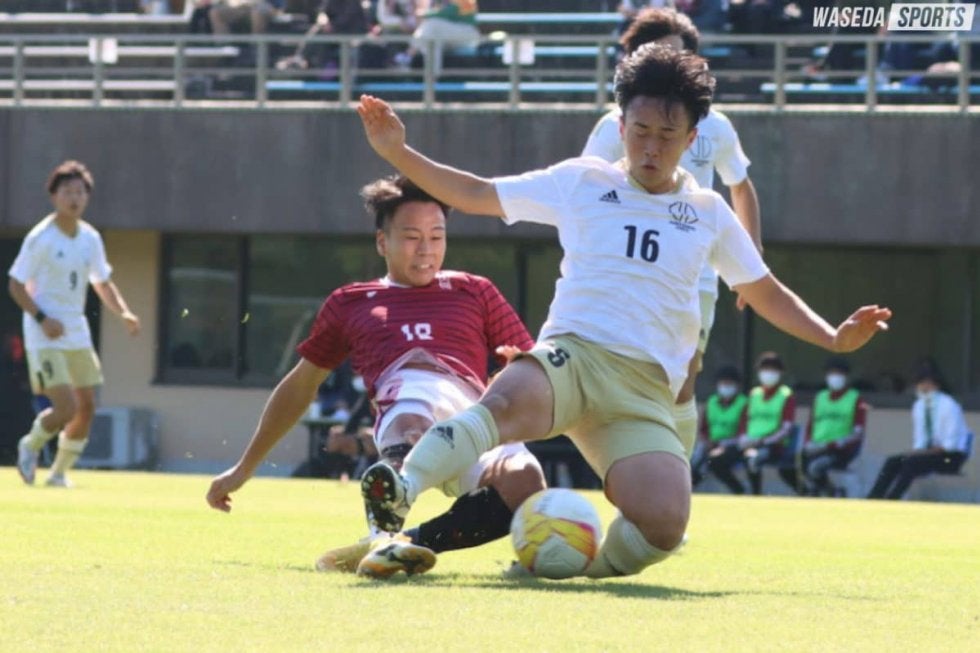 前半の立ち上がりは早大がペースを握る。8分、FW駒沢直哉(スポ2=ツエーゲン金沢U18)が1人で突破し、先制ゴールを決め幸先の良いスタートを切る。その後11分、1対1のピンチをGK平田周(スポ4=東京・国学院久我山)がファインセーブ、失点は免れた。一進一退の攻防が続く中、34分、相手FWが振り向き様にシュートを放つ。これを平田周が止めきれず、同点ゴールを許してしまう。完全にペースを掴まれ、38分にはCKから勝ち越される。43分、MF安斎颯馬(社2=青森山田)のFKからチャンスをつくるが、相手GKに阻まれ得点に繋げられず前半が終了した。
