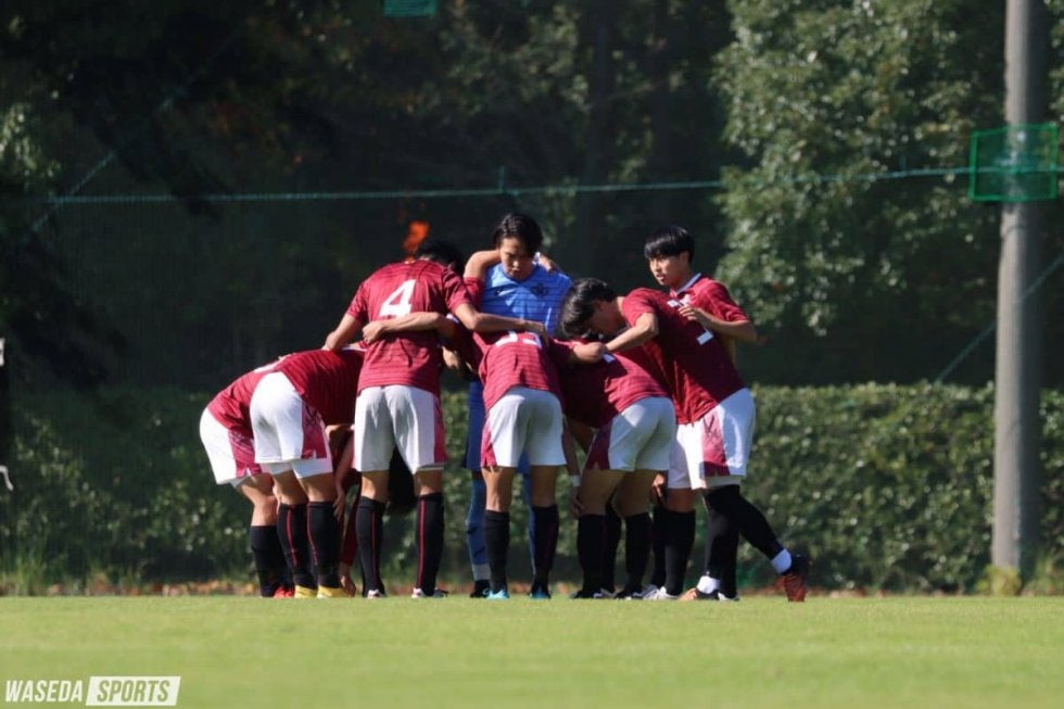 円陣を組む早稲田イレブン。背水の陣で挑む次節、「来週の1試合を大事に、戦っていきたい」と平瀬が語るように必ずや勝利を収めてくれるはずだ