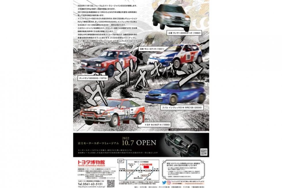 また11月11日からは企画展「WRC 日本車挑戦の軌跡 再び!」が始まる予定。昨年に引き続いての開催で、WRC参戦経験のある日本車メーカー7社の協力で、トヨタ博物館初登場を含む貴重な歴史的車両がズラリと並ぶという。会場は文化館2階企画展示室で、2023年4月16日(日)まで行われる。