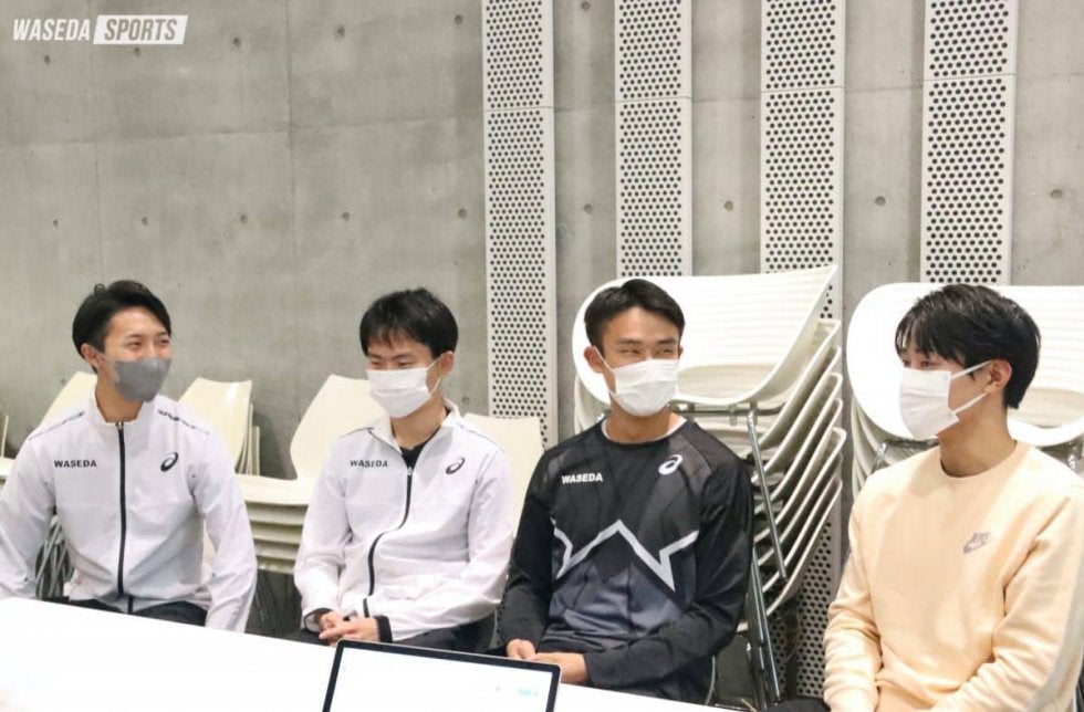 10月の日本選手権リレーで日本一に輝いた早大4×400メートルリレー(マイル)チーム。春の関東学生対校選手権(関カレ)で7位に沈んだ後、日本学生対校選手権(全カレ)での悔しい2位を経てつかんだ念願の頂点。初戦からメンバーの入れ替えをせずシーズンを駆け抜けた4人、新上健太(人3=東京・早実)、竹内彰基(スポ3=愛知・瑞陵)、藤好駿太(スポ3=福岡・修猷館)、眞々田洸大(スポ2=千葉・成田)はこの1年をどのように振り返るのか。全員が現3年生以下のチームが語る来年に向けての抱負とは。今年度の大会を終え、冬の鍛錬期を迎える4人に迫った。