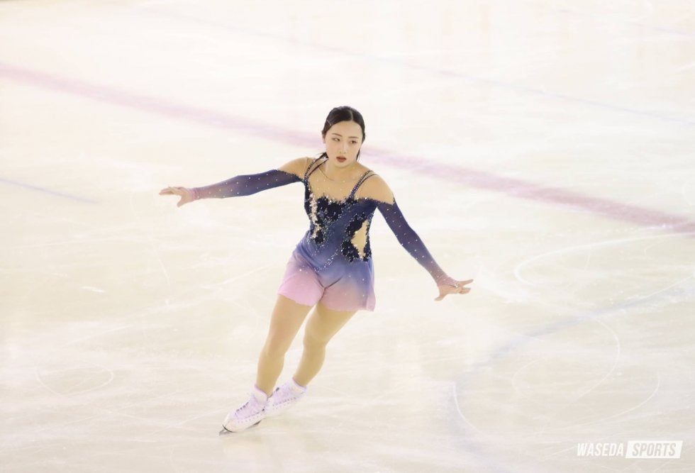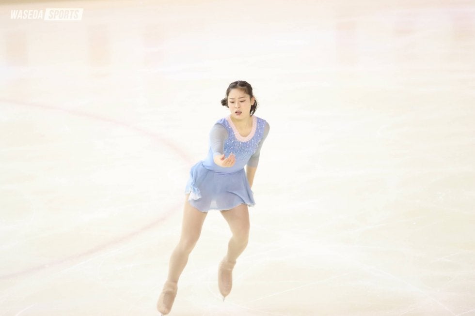 女子SP、最終滑走で登場した川畑。今シーズンは持ち味のジャンプがなかなか戻らず苦戦しているが、直前の6分間練習では3回転ジャンプをしっかりと着氷する様子が見られた。『シェルブールの雨傘』の曲が流れると、切なげな表情で滑り出し、会場全体を引き込む。冒頭、鍵となる3回転ルッツからのコンビネーションジャンプは、最初のジャンプでわずかに乱れるも、落ち着いて連続ジャンプに繋げる。柔らかく、流れるように跳んだ2回転アクセルは加点が付く出来栄えで着氷。直後に美しいツイズルも見せ、表現の一部に完璧に組み込まれたジャンプだった。最後の3回転ループは回転不足の判定を受けたが、プログラムの流れを切らさず、予定されていた全てのジャンプを降りた。情感たっぷりに演技を行った川畑は、スピンやステップでも力を発揮。全て最高評価のレベル4を獲得し、リンクを満遍なく使ったダイナミックなステップには1点以上の加点が付いた。細かいミスがありながらも、自らの強みを生かした演技で魅せた川畑の得点は55・03点。ケガからの復帰で苦しい時期が続いていた中、東日本学生選手権では「もっと練習から自分のことを追い込んで、本番で自信を持って滑れるようにしたい」と意気込んでいた。強い気持ちで臨んだ今大会、SP2位でFSに挑む。