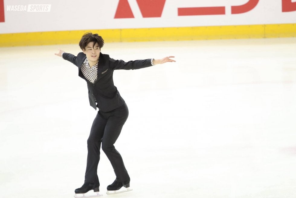 ジュニア女子SPの競技を挟み、夜に行われた男子SP。廣田聖幸(スポ2=千葉・東邦大東邦)は第1グループ5番滑走で登場した。少し緊張した表情でスタートポジションにつくと、特徴的なマイムの振り付けとともに演技を始める。冒頭の単独の3回転フリップは落ち着いて着氷。続く3回転サルコウ+2回転トーループはわずかに乱れるも、大きく崩れることなくまとめた。中盤のスピン、ステップでは減点があったが、アップテンポな曲に合わせ、リズミカルな滑りで演技を盛り上げていく。上々の演技を見せていた廣田だが、終盤のアクセルジャンプが1回転に。序盤の3回転ジャンプをしっかりと着氷していただけに悔しいミスだったが、引きずらずに、曲が鳴り止む瞬間まで躍動感あふれる滑りでプログラムを演じ切った。得点は42・34点。今大会では「ベストの演技をしたい」と意気込んでいただけに、最後のジャンプのミスは悔やまれる。大会ごとに磨き上げられたプログラムを見せている廣田が、5日に行われるFSではどのような演技を披露するのか、注目だ。