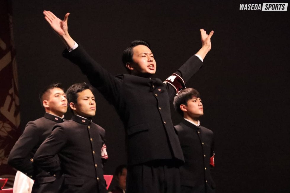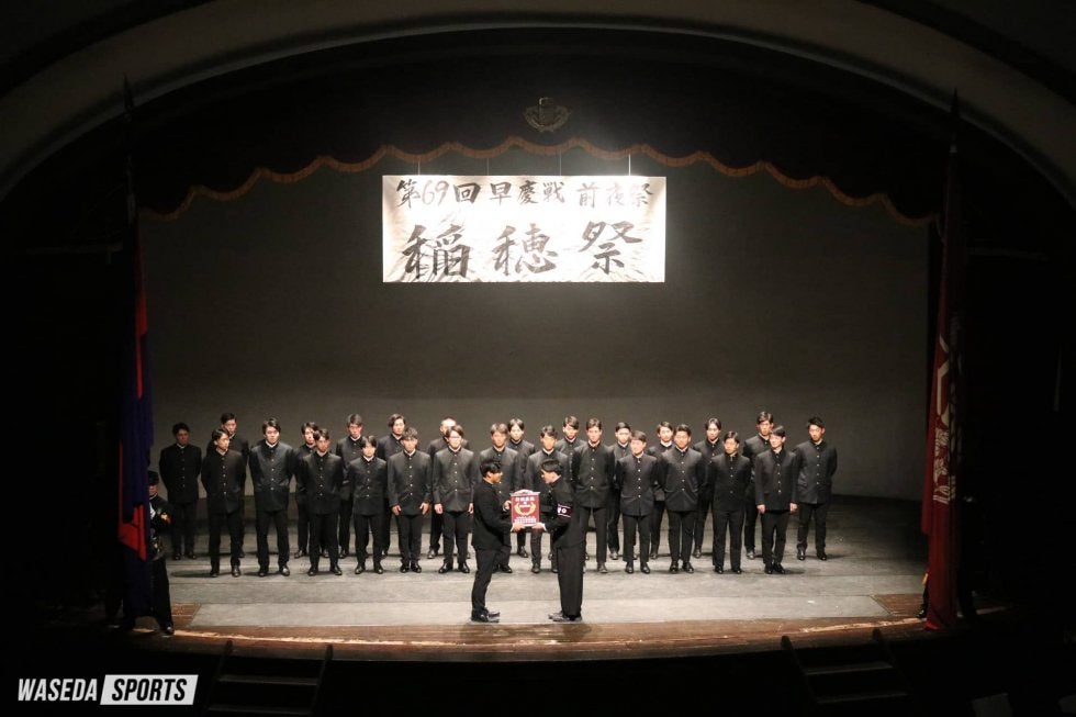 応援合戦を終えると、第3部は野球部壮行会。玉城大基学生誘導対策責任者(基理4=沖縄・昭和薬科大付)が司会進行を務めた。野球部・中川卓主将が早慶戦での躍動を約束すると、齋藤巽代表委員主将(教4=青森)からペナントが贈呈された。稲穂祭を締めくくるのは校歌斉唱である。齋藤を中心に野球部員、応援部員一同で3番まで腕を振り続けた。斉唱を終えると、最後は玉城が「必ずや打倒慶應を果たしましょう!」と呼びかけ、稲穂祭は幕を閉じた。