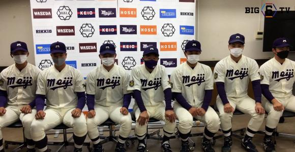 【優勝会見】明治大学 田中武宏監督・村松開人(④静岡)・蓑尾海斗(④日南学園)・蒔田稔(③九州学院)・村田賢一(③春日部共栄)・上田希由翔(③愛産大三河)・宗山塁(②広陵)