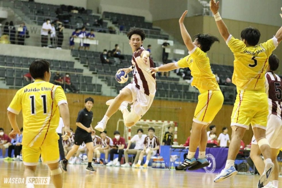「正直、良かったところを挙げるのは難しい」と永橋優太朗主将(スポ4=千葉・市川)が振り返ったように、持ち味を発揮できず、悔いの残る試合内容となった。開始直後に先制を許したが、早大も中惣健友(スポ4=石川・小松)のポストシュートですぐさま取り返す。その後は、両者が点を取り合う展開に。早大は、山田和直副将(スポ4=群馬・富岡)のミドルシュートや角辻尚樹(スポ4=奈良・畝傍)のサイドシュートなどで得点を重ね、13分で9−9と接戦を演じた。しかし、ここから大同大が連続得点。早大は、持ち味の守備が機能せず、相手の攻撃を止められない。17分で9-13とリードされた。永橋が獲得した7mスローや、山田の得点でなんとか食らいついた早大。15-19で前半を終えた。