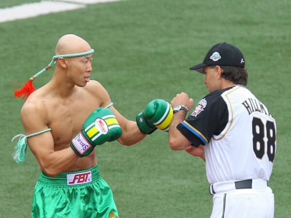 ムエタイファイターに扮した森本稀哲(左)とヒルマン監督