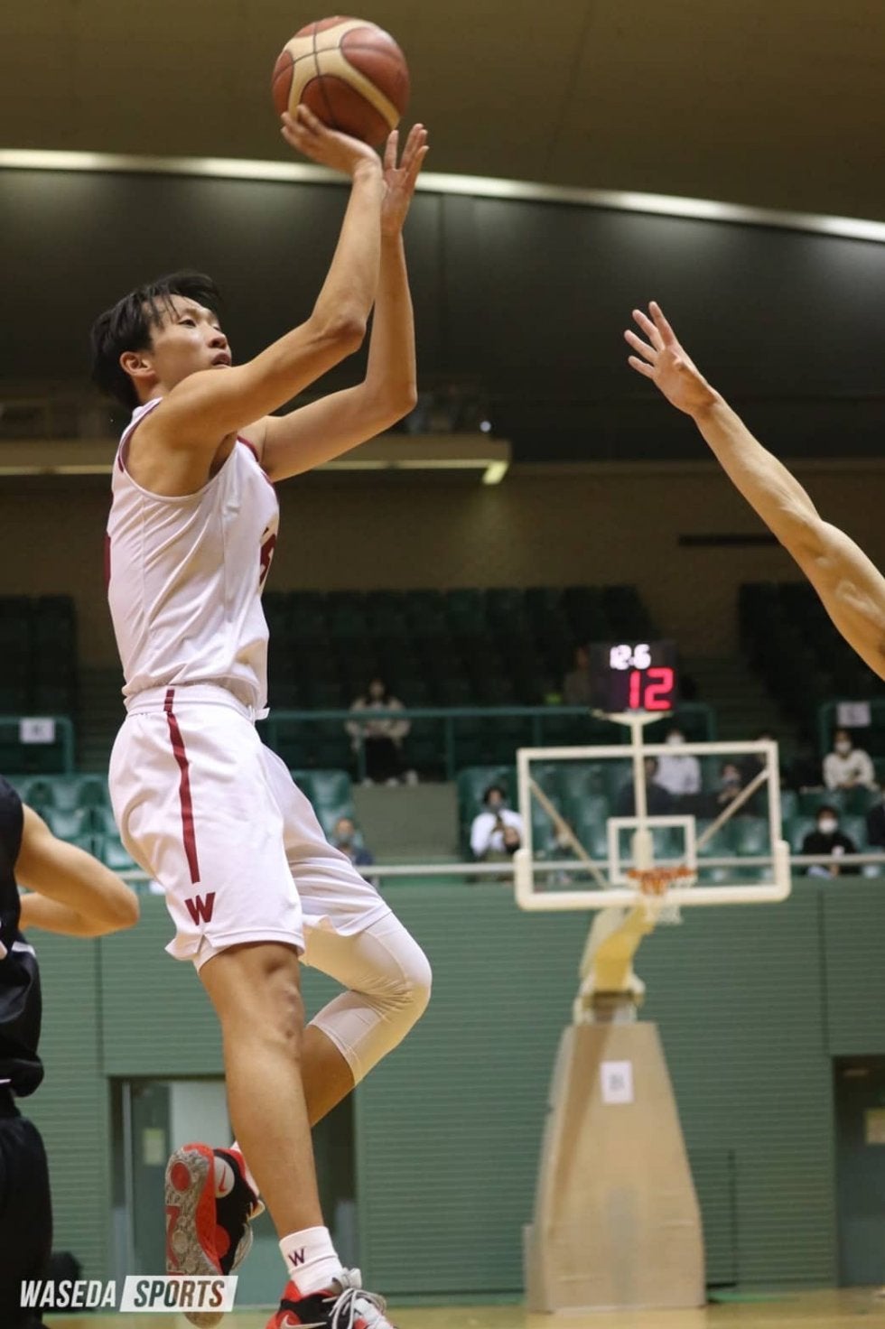 先制点は東洋大に奪われたが、F星川堅信(スポ3=京都・洛南)のスリーポイント、F石坂悠月(スポ2=東京・国学院久我山)のバスケットカウントで早大がリードする。その後は点の取り合いとなりリードを保ったまま第2Qへ。東洋大が24秒ショットクロック(※)のブザーとともにスリーポイントを沈めると、ここから流れが傾き始める。東洋大のゾーンプレスに苦戦し、早大はターンオーバーが増えた。タイムアウトで立て直しを図るも、スリーポイントを決められ、逆転を許す。第2Q終盤、星川のブザービーターで再逆転するも、流れは東洋大のまま38-37で前半を終えた。