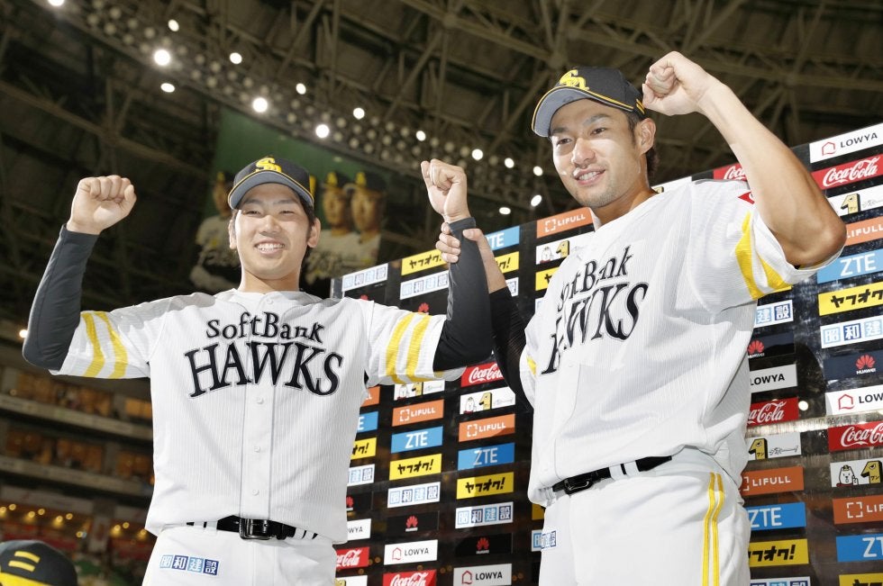 ソフトバンク―ヤクルト ヤクルトに勝利し、お立ち台でポーズをとるソフトバンク・石川(左)と柳田=ヤフオクドーム【写真提…