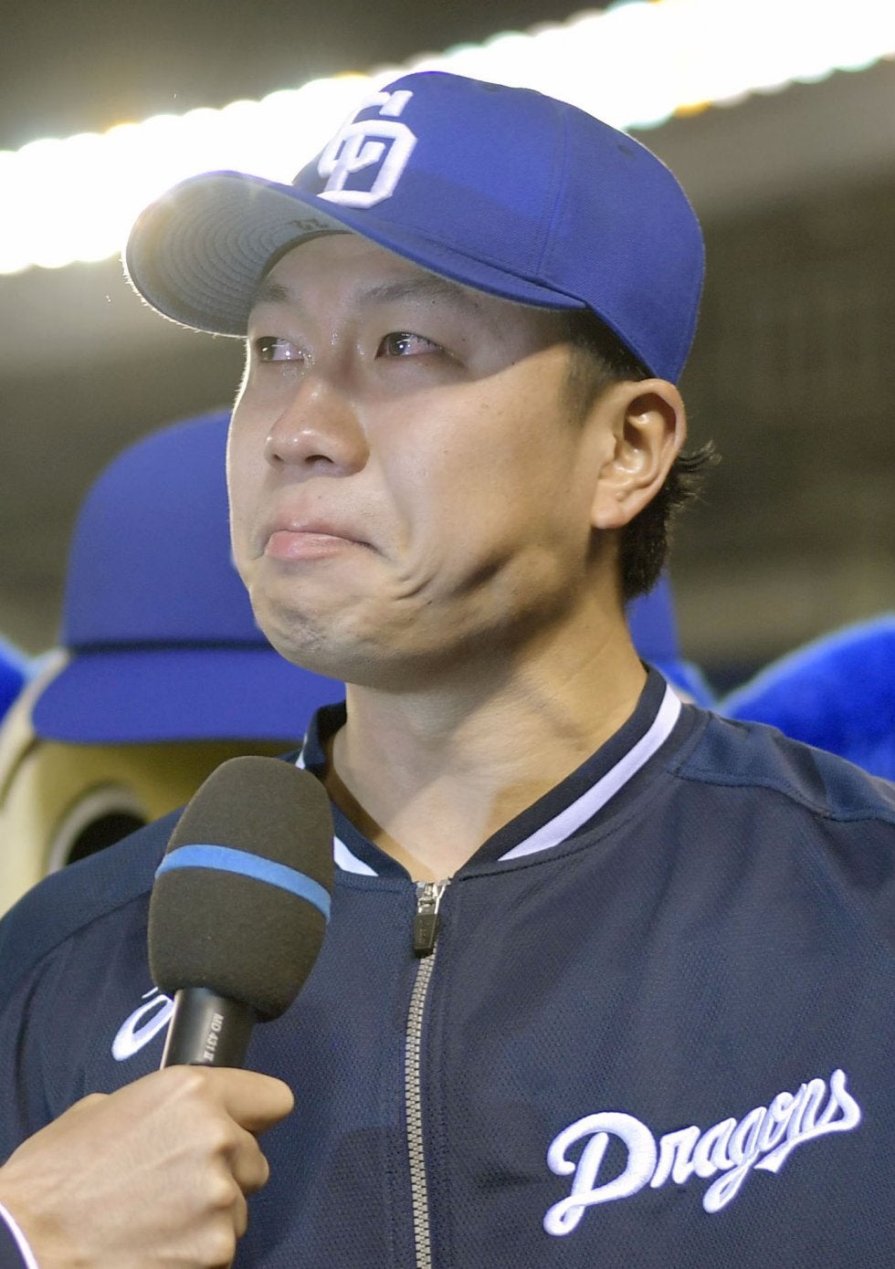 ロッテ―中日 今季初勝利を挙げ、ヒーローインタビューで涙ぐむ中日・大野=ZOZOマリン【写真提供:共同通信社】