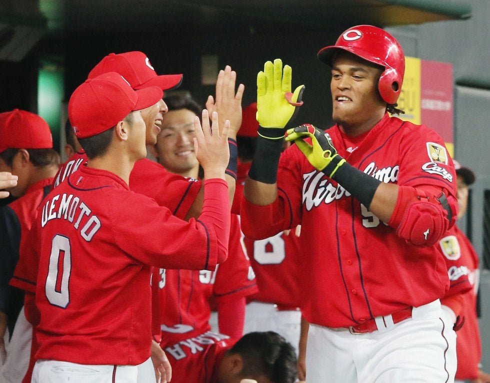 日本ハム―広島 5回、この試合2本目となる本塁打を放ち、ナインとタッチを交わす広島・バティスタ=札幌ドーム【写真提供:共同通信社】