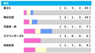 過去10年、前走・富士S組【2.3.2.43】、毎日王冠組【2.1.2.19】、天皇賞・秋組【2.1.2.7】、スプリンターズS組【2.0.0.6】と、4競走が2勝で横並び。最多6頭が馬券に絡んでいる前走・富士S組はGII昇格後の2年間で計8頭が出走し、5番人気ダノンザキッドの3着が最高着順。2着以上は2018年のペルシアンナイトまで遡る。