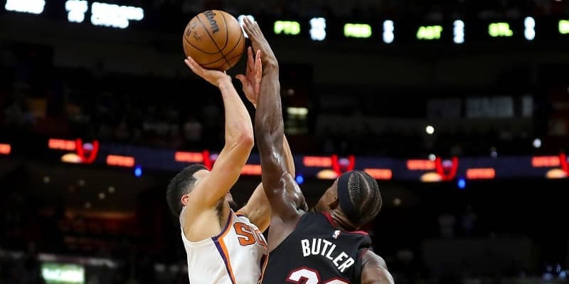 トップ下からブッカーが右エルボーへ向かってプルアップジャンパーを狙うも、ジミー・バトラーが完璧なタイミングでブロック。そのこぼれ球をブッカーが手にし、右ウイングから逆転をかけてなんとか3ポイントシュートを放つも決まらず、ヒートが113-112で競り勝った。