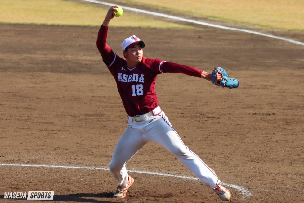 早大の先発・佐藤慶弥副将(スポ3=静岡・飛龍)は初回から無死一、二塁のピンチを招くも、相手のクリーンアップを打ち取り、無失点で抑える。しかし、2回に7番・青柳湧大(2年)に中越え本塁打を浴び、くしくも秋季リーグ戦と同じ形で先制を許した。直前に逆転し、大量の援護を得た3回からは稲垣拓朗(スポ2=群馬・新島学園)が登板。5回までの3イニングを6奪三振無失点の快投で佐藤玲にマウンドを託した。続いてマウンドに上がった佐藤玲は持ち前の投げっぷりの良さを遺憾なく発揮。6回を三者三振でスコアボードに0を並べると、7回には反撃を期す慶大打線を9球で片付け、試合を締めくくった。