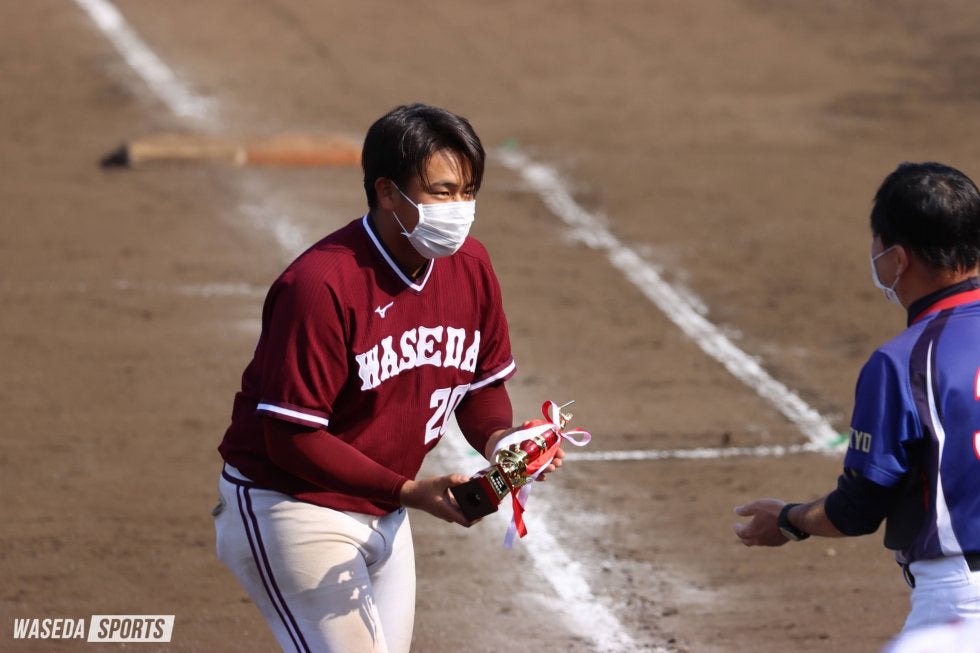 試合後には表彰式が行われ、「理想に近いピッチングができた」と会心の投球を見せた佐藤玲が優秀選手賞を受賞した。昨年優秀選手賞を受賞した服部耕太郎(スポ2=東京・本郷)は今春から出場機会を増やし、秋季リーグからレギュラーをつかんだ。服部同様、この日3番に抜擢された佐藤玲にも来年以降の飛躍が期待できそうだ。