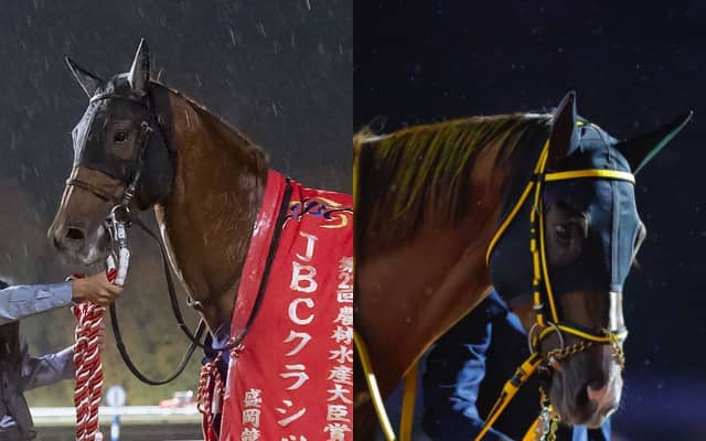 テーオーケインズ(左、提供:岩手県競馬組合)、メイショウハリオ(右、撮影:下野雄規)