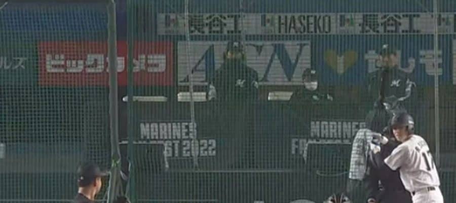 ファン感謝祭で佐々木朗希を打ち取ったロッテ・田村龍弘(左)【画像:パーソル パ・リーグTV】