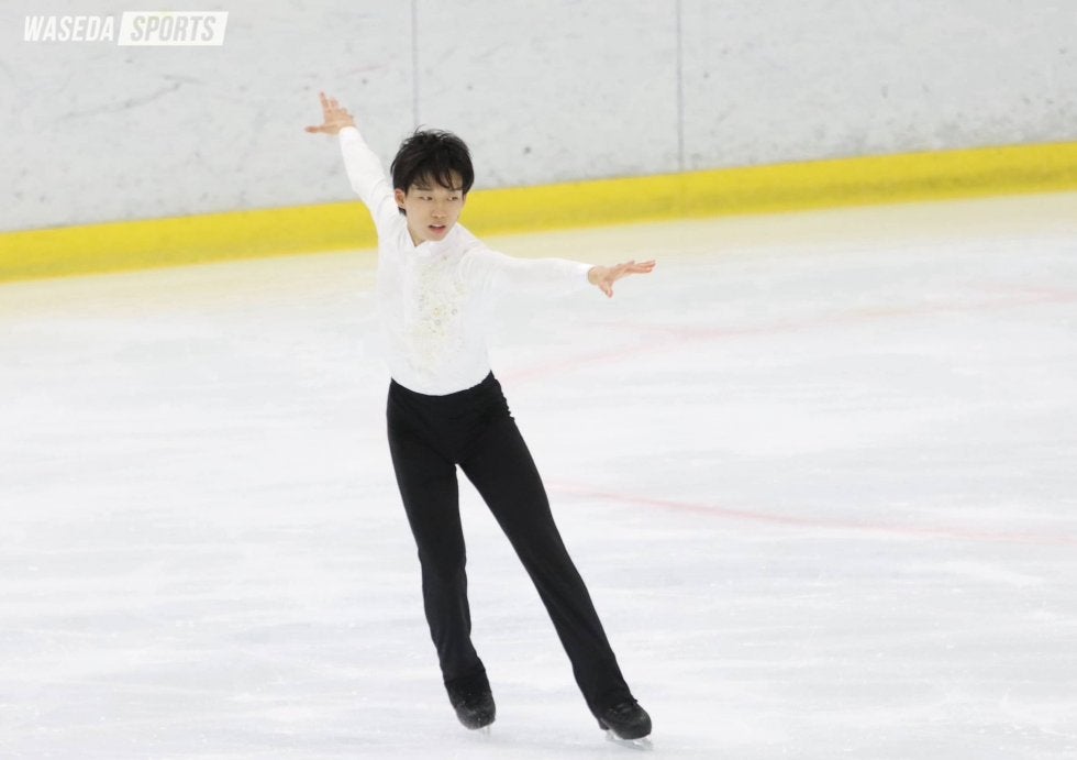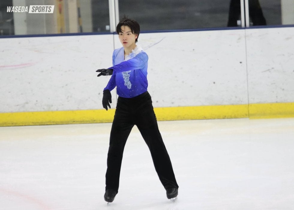 早大勢トップバッターで登場したチェンドンシェン(文構4=シンガポール・マクファーソンセカンダリースクール)は、1級男子部門の競技に出場。直前練習からジャンプに乱れがあったものの、時折笑顔を見せながら調整を行なった。演じるプログラムは『春よ来い』。しっとりとしたピアノの音色に合わせて滑り出した。ジャンプでは着氷時にバランスを崩す場面があったものの、体を大きく使い、丁寧に曲を表現。関係者が集まる会場からはエレメンツに挑むたびに温かな拍手が送られた。特に演技終盤に披露したレイバックイナバウアーには会場が盛り上がった。ジャンプでミスがあり、「悔しかった」と語ったように納得のいく演技とはならなかったものの、曲の世界観を存分に表現したチェンドンシェンの得点は9・90点。少し悔しさをにじませる結果となった。演技後は反省点を挙げつつ、「最高の演技をできるよう、(プログラムを)磨き上げて、悔いのないスケート生活をこれからも送りたい」と、残りわずかとなったスケート生活への思いを語った。