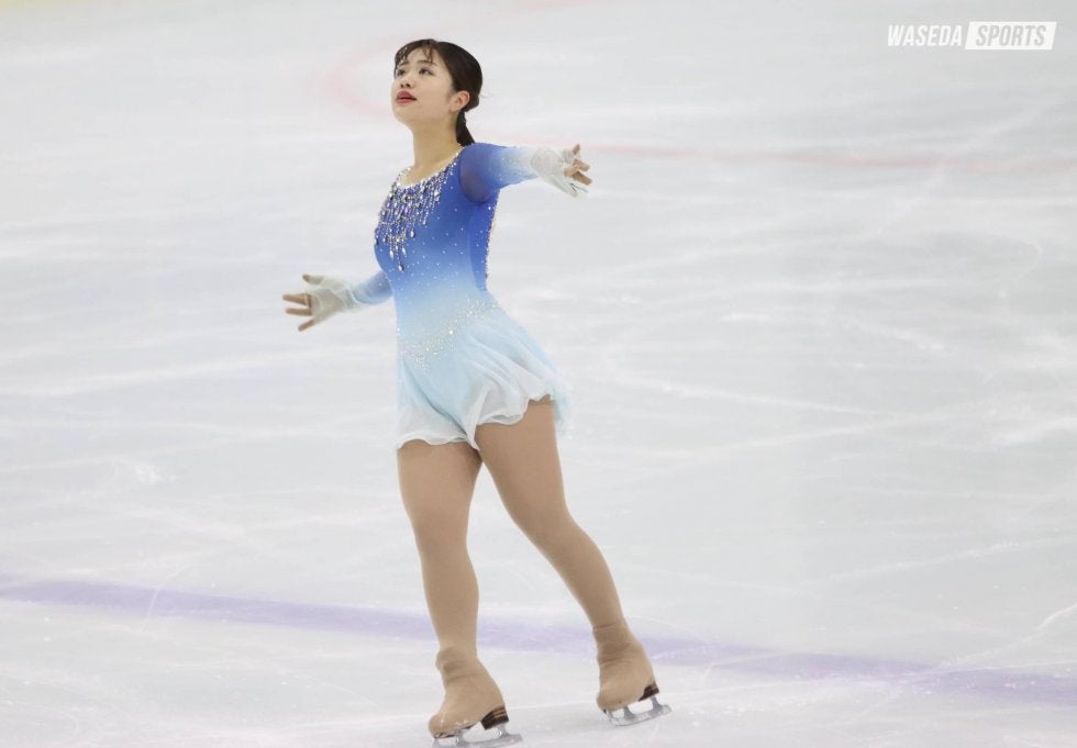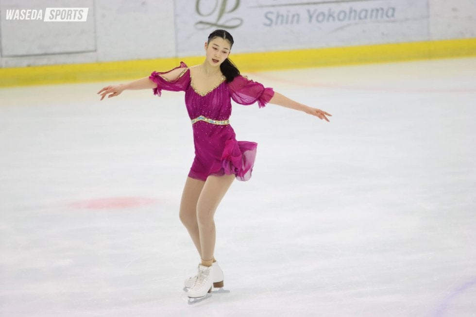 5級女子に出場したのは、「上品で高貴なイメージ」の衣装を身にまとった正村瞭子(文構4=東京・早実)。演技冒頭からスピードに乗ってのびやかなスケーティングを披露する。1本目のコンビネーションジャンプを成功させると、長い手足を存分に使った美しいスピンで魅了。このまま流れに乗るかと思われたが、「2つ目のジャンプの2回転ループがずっと外れていて心配だった」と話したループジャンプで転倒すると、続く3本目のジャンプも転倒。直後のジャンプと最後のコンビネーションジャンプは切り替えて確実に着氷したものの、スパイラルでは思わぬ転倒もあり、精彩を欠いた。ミスが響き、得点は42・66点。得点は伸び悩んだものの、最後まで力強いステップと体を大きく使った表現で演じ切った正村。前回の東インカレと今大会では、ともにメンタルの弱さを実感したと話す。「メンタルと技術が直結しないように気をつけていきたい」と意気込み、4年間の集大成となる次戦の全日本学生選手権(インカレ)に、全てをかける。
