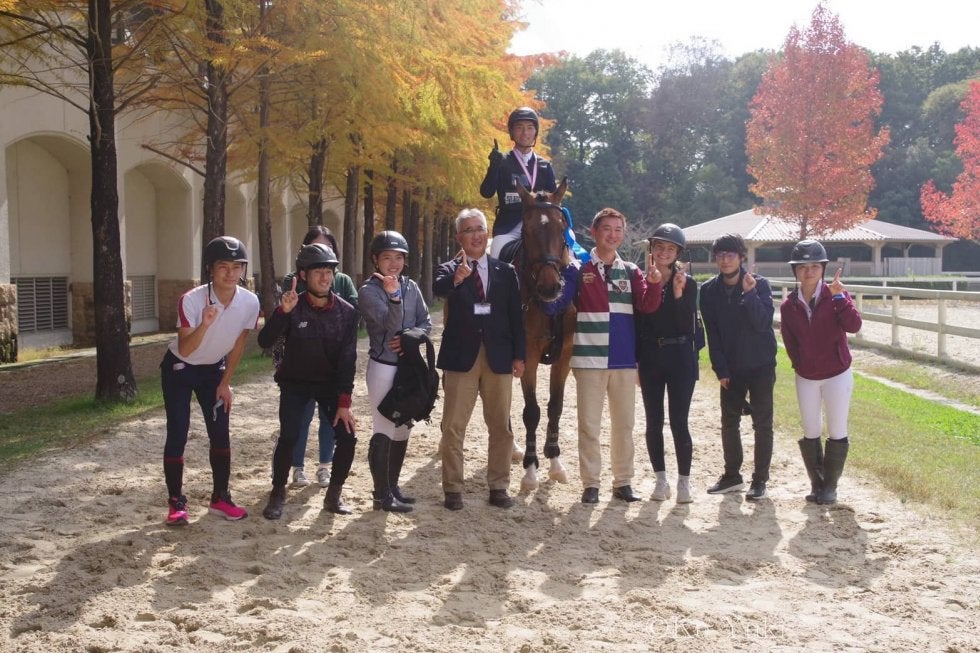 障害馬術の表彰式後に全員でポーズを見せる馬術部一同