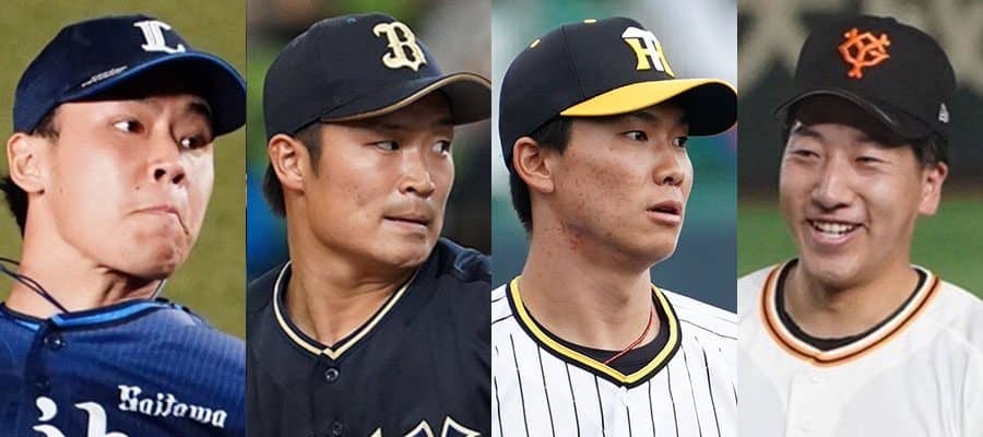 西武・水上由伸、オリックス・阿部翔太、阪神・湯浅京己、巨人・大勢(左から)【写真:荒川祐史】