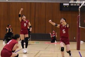 ブロックポイント後に喜ぶ秋重(左)、神庭