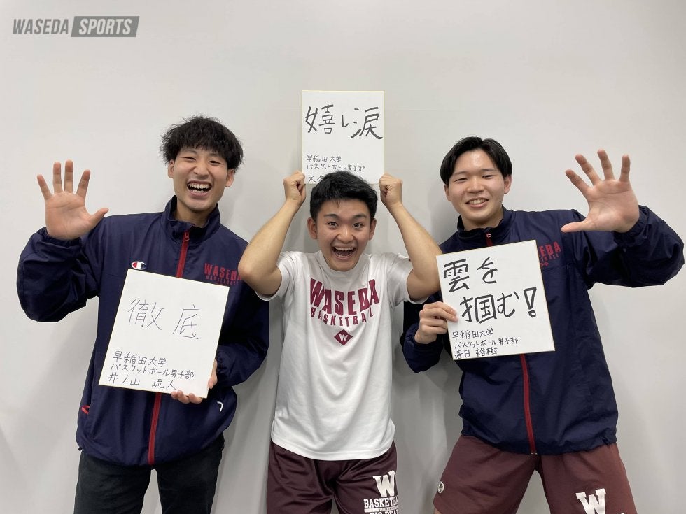 初回を飾るのは、コートの側で選手を支え続ける井ノ山琉人学生コーチ(スポ3=東京・豊多摩)、大倉隆太学生コーチ(教3=東京・早実)、春日裕樹学生コーチ(文構3=東京・国学院久我山)の3人。選手とは少し異なる学生コーチの視点から、2022シーズンを振り返ってもらった。