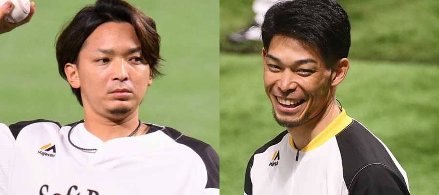 ソフトバンク・東浜巨(左)と又吉克樹【写真:藤浦一都】