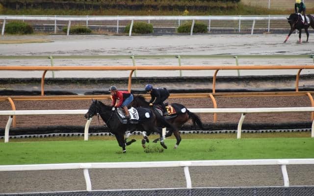1週前追い切りを行ったリバティアイランド(写真右の青帽、撮影:井内利彰)