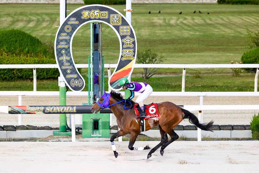 1日、園田競馬場で行われた11R・園田金盃(重賞・3歳上・ダ1870m・1着賞金=3000万円)は、下原理騎乗の1番人気、ラッキードリーム(牡4・兵庫・新子雅司)が6馬身差で圧勝。門別で活躍した同馬が園田でも躍動した。2着に2番人気のジンギ(牡6・兵庫・橋本忠明)、3着に6番人気のクリノメガミエース(牝3・兵庫・石橋満)が入った。勝ちタイムは2:02.2(稍重)。