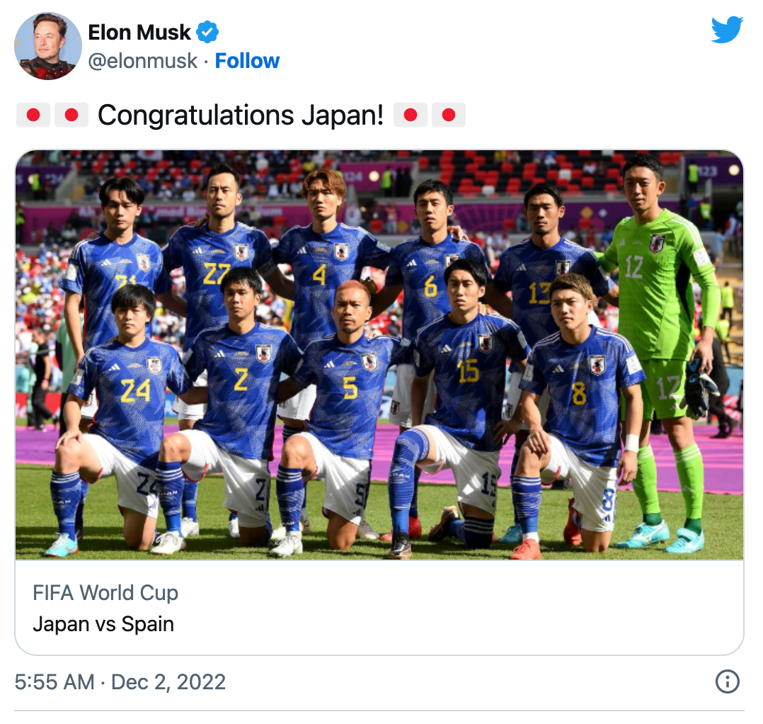 米ツイッター社を買収したイーロン・マスク氏が2日、自身のツイッターを更新。スペイン戦で勝利した日本に向けて、祝福の言葉を…