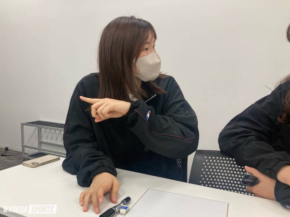 川岸 お互いが思っている感じです(笑)。話し合いとかよくあるんですけど、よく泣き出すんですよ。最初のうちはこの人大丈夫かなって思ってたんですけど、試合とかだと留学生の選手とかとやり合ってて、普段のイメージとは違ってびっくりしました。雛菜さんはエムさん(江村優有、スポ2=愛知・桜花学園)に(プレーについてのアドバイスを)色々言われてるんですけど、自分も最近結構言ってもらえてて。エムさんに教わる仲間として意識してます。