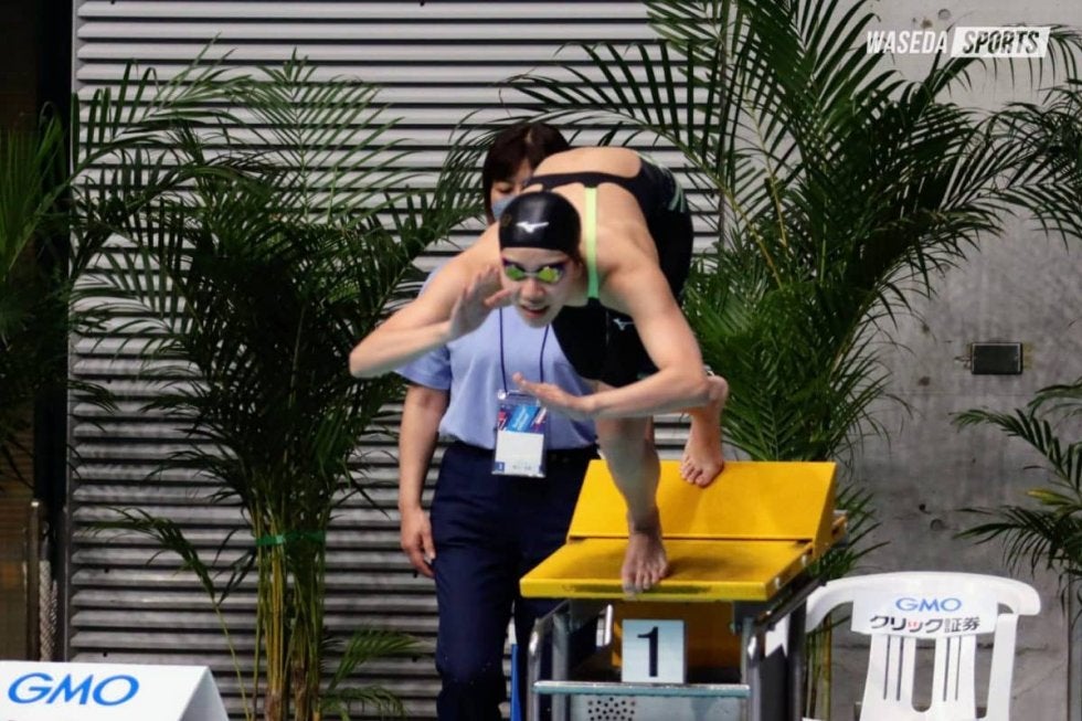 日本学生選手権(インカレ)以降の新体制で女子主将となった今牧まりあ(スポ4=長野・飯田)が、女子50メートル自由形に挑んだ。自己ベストの更新が目標だったが、直前まで泳ぎの調子が上がらず不安があったと言う。実際に予選では飛び込みの時点で若干出遅れたが、後半に勢いを取り戻して7位で通過する。決勝にはスタートの反応とタッチの合わせ方を改善して臨んだ。