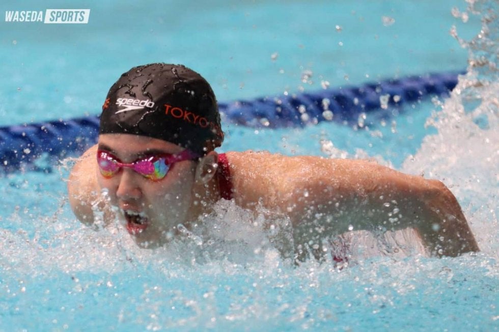 前日の200メートル個人メドレーで銅メダルを獲得した松本信歩(スポ2=東京・東学大付)。しかし、今回はもう一つの得意種目であるバタフライでも2種目に出場。この日は100メートルに臨んだ。前日には「予選で16位以内に入れるように」と語っていたが、後半で盛り返して予選7位のタイムを残し、2種目目となる決勝進出を果たすことができた。