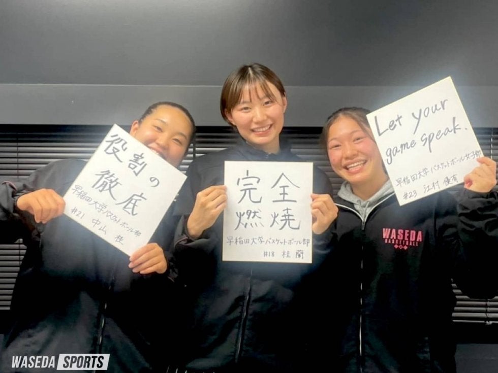 最終回を飾るのは愛知・桜花学園出身で現在チームの中心となっている3人だ。ケガにより昨年秋から試合出場はないものの主将としてチームを支えてきた桂蘭主将(スポ4=愛知・桜花学園)、勝負どころで決めきるスリーポイントで勝利に貢献してきた中山桂(スポ3=愛知・桜花学園)、今年の夏には日本代表としても活動した早大のエースガード江村優有(スポ2=愛知・桜花学園)の3人に話を伺った。