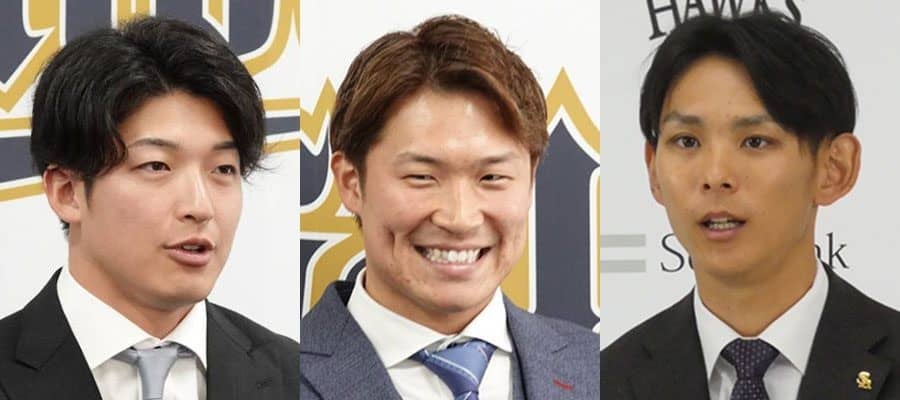 契約更改交渉に臨んだオリックスの山崎颯一郎、阿部翔太、ソフトバンクの泉圭輔(左から)【写真:橋本健吾、福谷佑介】