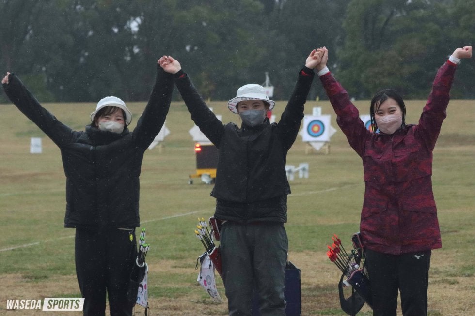 女子70メートルラウンドでは両校それぞれ8人が70メートルを72射行射し、両校の上位4名の点数の合計で勝敗を決める。早大は髙見愛佳女子主将(スポ3=エリートアカデミー)、田中伶奈(人3=東京・国際)、廣木円華(人3=茨城・水戸二)、園田稚(スポ2=エリートアカデミー)、塚本美冴(スポ2=東京女学館)、廣瀬心咲(人2=東京・雙葉)、渋谷樹里(スポ1=エリートアカデミー)の4月の関東学生リーグ戦(リーグ戦)を戦ったメンバーに細井眞美子(人3=東京・早実)を加えた8名で臨んだ。36射で300点を超えたのが前半の園田のみとなるほどの難しいコンディションの中、第1セットから先行すると、そのままリードを許さず、手堅く勝利。2015年から続く早慶戦の連勝を8に伸ばした。