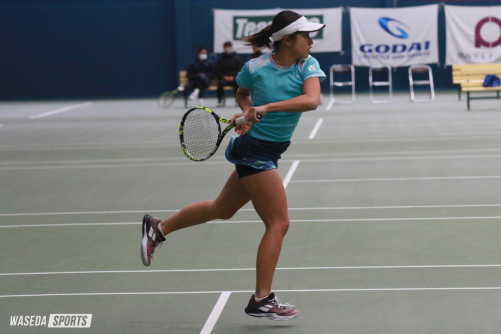 女子シングルス決勝は、3年生の神鳥と2年生の梶野との同士討ちとなった。神鳥のサービスゲームで始まった第1セット。神鳥は梶野に1ポイントも許すことなく、3ゲームを連取する。続く第4、5ゲームはポイントを奪われながらも梶野を左右に振り、浮いたボールを叩くなどしてポイントを重ね、獲得。第6ゲームは梶野がキープしたものの、第7ゲームを神鳥がしっかり獲得し、6-1で第1セットをものにした。