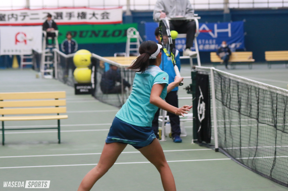 全国ランキング上位者32人、16組が全国タイトルを争う全日本学生室内選手権(インカレインドア)。最終日は決勝が行われた。女子シングルス決勝は神鳥舞(スポ3=東京・早実)と梶野桃子(社2=京都外大西)の組み合わせ。女子ダブルス決勝は前回大会覇者で今年の全日本学生選手権(インカレ)優勝ペアの神鳥・斎藤優寧(スポ2=岡山学芸館)組と石川琴実(社4=神奈川・白鵬女)金子さら紗(スポ1=埼玉・浦和麗明)組の組み合わせとなり、単複ともに早大対決で日本一を争うことに。結果は女子シングルスは神鳥が優勝、女子ダブルスは神鳥・斎藤組が大会2連覇を飾り、神鳥は単複同時優勝の快挙を成し遂げた。
