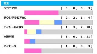 過去10年、最多3勝を誇る前走・ベゴニア賞組は未出走。続く2勝をマークしている前走・サウジアラビアRC組は【2.2.1.4】で複勝率55.6%を誇り、昨年こそ未出走だったが、2018年のグランアレグリアが3着、19年のサリオスが優勝、20年のステラヴェローチェが2着と、出走機会3年連続で馬券内をキープしている。