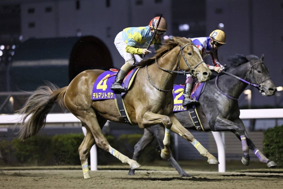 14日、川崎競馬場で行われた11R・全日本2歳優駿(Jpn1・2歳オープン・ダ1600m)は、松若風馬騎乗の3番人気、デルマソトガケ(牡2・栗東・音無秀孝)が勝利した。アタマ差の2着に2番人気のオマツリオトコ(牡2・美浦・伊藤圭三)、3着に1番人気のペリエール(牡2・美浦・黒岩陽一)が入った。勝ちタイムは1:43.3(稍重)。