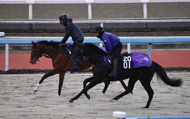 12月15日にゲート試験を合格した友道康夫厩舎の2頭。写真手前のオクタグラムは母系に2016年日経新春杯を制したレーヴミストラル(父キングカメハメハ)などがいるエピファネイア産駒。写真奥はディープインパクト産駒のスイープトウショウの2020(スイープアワーズ)。