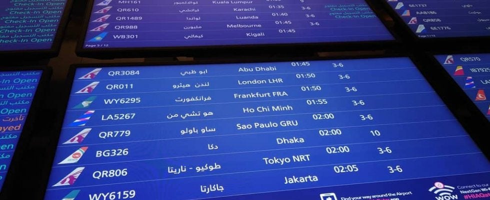 成田行きのフライトを掲示するハマド空港内の電光掲示板 撮影:中地拓也