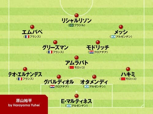 ともに準決勝で敗退した、クロアチアからはペリシッチを、モロッコからはハキミとアムラバトをそれぞれ選出。すでに中盤から前は飽和状態のため、ペリシッチはいくつかの試合でこなした左SBで、アムラバトは急造でこなしたCBに回ってもらうことにした。