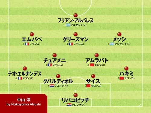 前線は、メッシ、グリーズマン、エムバペ、フリアン・アルバレスの4人。大会MVPのメッシ、得点王の怪物エムバペは、もはや問答無用。攻守にわたるキーマンとなったグリーズマンと、ブレイクした若手としてスポットライトを浴びたフリアン・アルバレスを1トップとした。