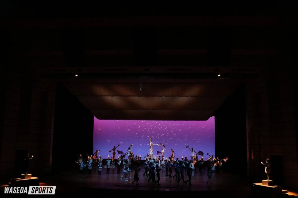 今年も定期演奏会を締めくくるのはドリルステージ(第4部)である。今年度の吹奏楽団目標『星のパズル』にちなんで選曲した1曲目『スター・パズル・マーチ』では、その名の通り星のきらびやかさを描き出した。2曲目では『Try Everything』を披露。この楽曲ではチアリーダーズとともに、映画『Zootopia』の世界観を視覚と聴覚をもって情景を描き出した。吹奏楽団とチアリーダーズによるダイナミックなパフォーマンスが終わると、今度は少人数で魅せる。まずはバッテリーパート7人が『Cheetah』を披露。曲名にふさわしく疾走感あるこの曲を打音でもって響かせた。続いて、カラーガードパートは9人で『Part of your world』を披露。小林里紗子インスペクター(法4=東京・大泉)によるピアノ演奏とともに、カラーガードで海の世界を描き出した。そして、最後に吹奏楽団が連れ出した世界は、愛と冒険の舞台『The Mask of Zorro』の世界である。吹奏楽団全員が結集し、隊形で、演奏で、旗で、踊りで、照明で景色を完成させる。激しいアクションシーンから華やかなゾロの登場シーンまで持っている全ての力で演出し、ドリルステージを完走した。拍手とともに一度ホールの幕は閉じるが、拍手はやがてアンコールへと変わる。再び幕が開けると、吹奏楽団が待つ中、江渕太朗代表委員主務(文4=東京・海城)が姿を現した。吹奏楽団との思い出を学注(学生注目)に乗せると、いつもとはひと味違う応援曲メドレーがスタート。吹奏楽団が隊形を変えながらメドレーを進めると、リーダーとチアリーダーズもフラッグやパネルを手にアシストした。最後は「W」の隊形でメドレーを終え、客席からは割れんばかりの拍手。最後の最後まで手を振り続け、今年の定期演奏会は幕を降ろした。