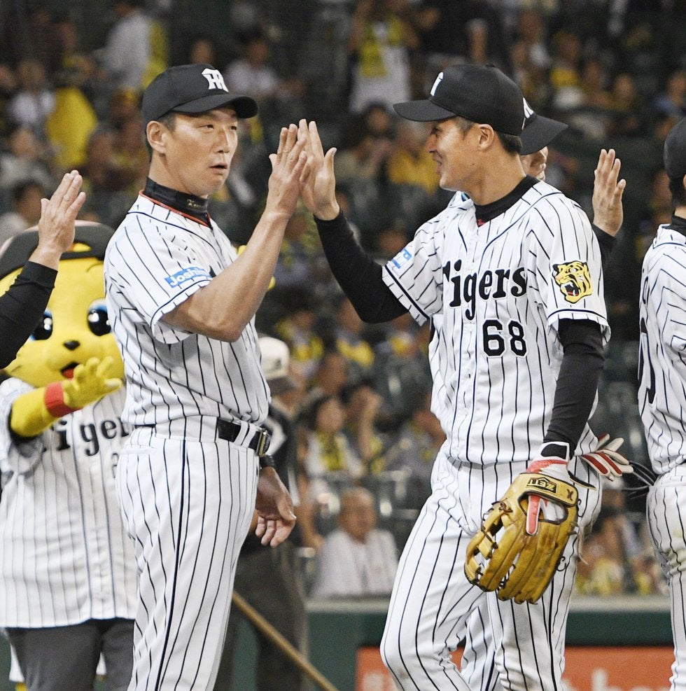 阪神―西武 西武に勝利し、俊介(右)を迎える阪神・金本監督=甲子園【写真提供:共同通信社】