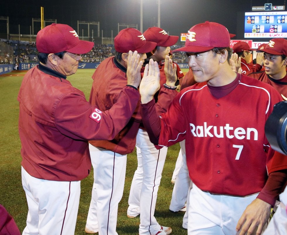 ヤクルト―楽天 ヤクルトに勝利し、梨田監督(左)とタッチを交わす楽天・松井稼=神宮【写真提供:共同通信社】 打線が爆発し…
