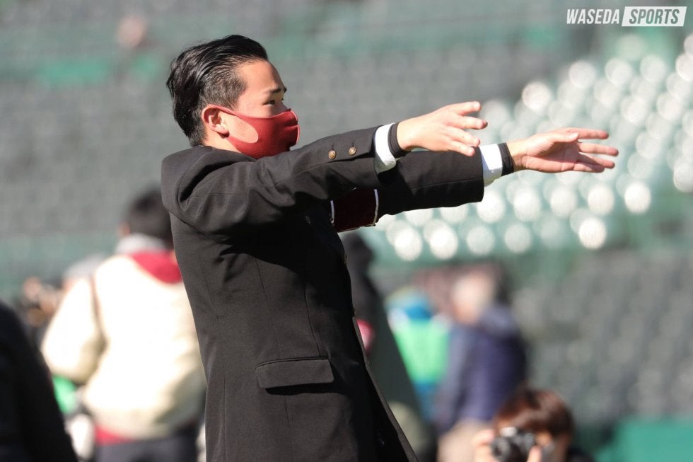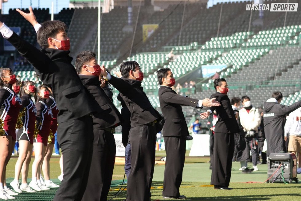 時刻が正午に差しかかる頃、レフト側ポール付近で校旗が掲揚され、応援合戦が幕を開けた。三塁側を陣取った応援部はグラウンドにチアリーダーズとリーダーが立ち、吹奏楽団が応援席で座奏する構成で関学大と交互に披露。日本一をかけた戦いを前に観客と応援練習を行った。1曲目は『暴れん坊早稲田』。応援曲メドレーでは『大進撃』をはじめ応援曲の前に接続することも多いこの応援曲だが、ワンプレーが終了するたびに選手を励ますため、今回は単独での演奏が行われた。続く『GUTS!』は第1クォーターと第3クォーター開始時に演奏される曲。チアリーダーズ総勢39名がチアステの疲れを感じさせない力強いダンスを見せれば、吹奏楽団は力強く音色を甲子園の空に響かせた。3曲目の『Viva Waseda』に突入すると髙橋幸太リーダー練習責任者(教4=茨城・竜ヶ崎一)がセンターリーダーに。続く『バンビーナ』でもセンターリーダーを務めた髙橋。自身にとって最後となるテクを終始丁寧に振る姿が印象的であった。応援合戦も終盤に差しかかると、おなじみの『コンバットマーチ』。リーダー4年生5名と背後のチアリーダーズによる渾身の突きは、試合開始を前に早大の闘志を呼び起こす。最後は『紺碧の空』と『得点校歌』を演奏し、早大の得点を祝う準備を整えた。試合前の応援活動の最後を飾るのは、校歌斉唱によるエール交換。江渕太朗代表委員主務(文4=東京・海城)を中心に拳を振り、「王者を占むるは覇者早稲田」の文字切りで早大の勝利を願った。