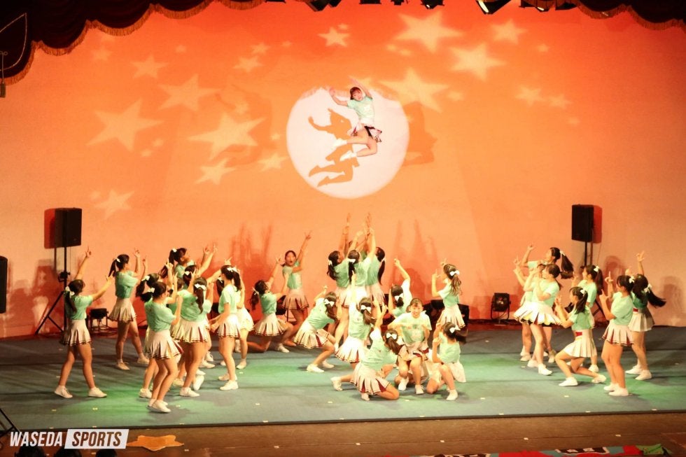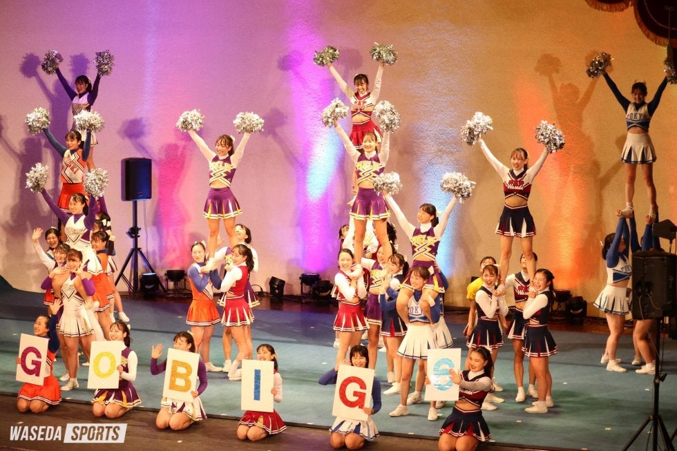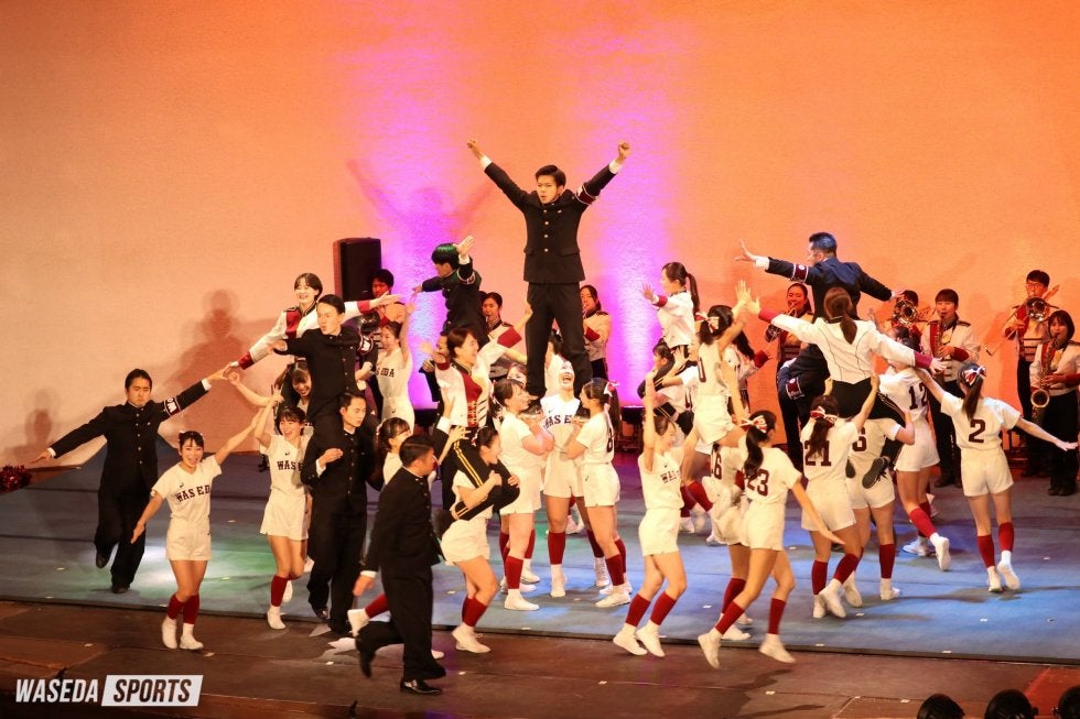 第2部はHT(ハーフタイム)からスタート。この1年間使用してきた、Bruno Mars、Beyoncéらのヒット曲による洋楽メドレーでダンスにもキレが増す。各種応援で披露してきたハーフタイム演技の集大成となった。続いて体育各部からのBIGBEARSへの応援メッセージが放映されると、BIGBEARSが「応援メドレー」でお返し。競技をイメージした選曲のもと、振り付けにも工夫を加え、米式蹴球部、競走部、ラグビー部、野球部など計9競技へエールを送った。そしてこのチアステはリーダー4年生、吹奏楽団4年生にとっても最後のステージである。チアリーダーズの前に井上皓介副将(法4=東京・早大学院)、背後に吹奏楽団がスタンバイすると「応援ドリル」がスタート。リーダー4年生はセンターリーダー、吹奏楽団4年生はマーチングドリルで本職を全うしながらも、後半ではラインダンスやスタンツなどチアリーディングも披露し、チアステならではの応援曲メドレーをつくりあげた。玉城大基学生誘導対策責任者(基理4=沖縄・昭和薬科大付)がメドレー途中の学注(学生注目)で口にした4年間の感謝の思い。その感謝の思いを3パートの4年生全員が持ち、「応援ドリル」を完成させた。4年生は他パートの同期へ別れを告げると、そのまま「引退構成」へ。4年間を振り返るVTRが放映されると、同期24人による最後の演技が始まった。最高学年らしい熟練したパフォーマンスの中には4年間の愛と想いが込められる。次々と演技を成功させ、「334」で「引退構成」を完走した24人の笑顔はとても生き生きとしていた。そしてフィナーレでは令和4年度のBIGBEARSを締めくくる。選曲した阿部真央氏の『Believe in yourself』の歌詞には彼女たちのメッセージが宿る。BIGBEARS71名全員の努力がこもったパフォーマンスは観客全員に大きな愛を届け、観客も万雷の拍手で称えた。BIGBEARSはアンコールにも応え、2時間以上にわたるステージを見事完走。幕が下りる最後の時まで観客に笑顔を送り続け、BIGBEARSを全うした。
