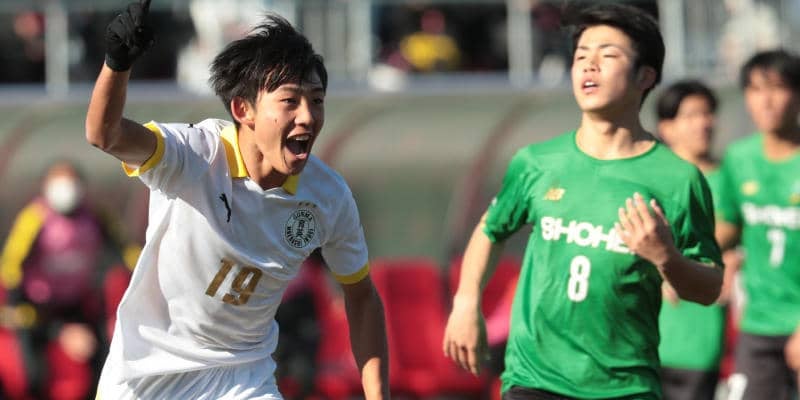 今大会の優勝候補対決は開始早々に動く。3分、相手ハイラインの裏に出たボールに追いついた上野旭陽のシュートこそボックスの外まで飛び出した相手GKにブロックされるが、FC東京入り内定の荒井悠汰がセカンドボールを左足で蹴り込み、昌平が一歩前に出る。